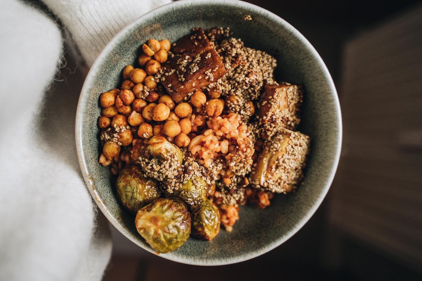 En este plato puedes encontrar todo lo necesario para conseguir un plato saciante y de manera muy sencilla: abundante proteína en el tofu y garbanzos, también encontramos fibra en garbanzos, arroz y coles de bruselas y grasas (aceite de oliva y semillas). Si no tienes costumbre de utilizar el tofu en tus platos, puedes cambiarlo por ejemplo por tiras de pechuga de pollo.