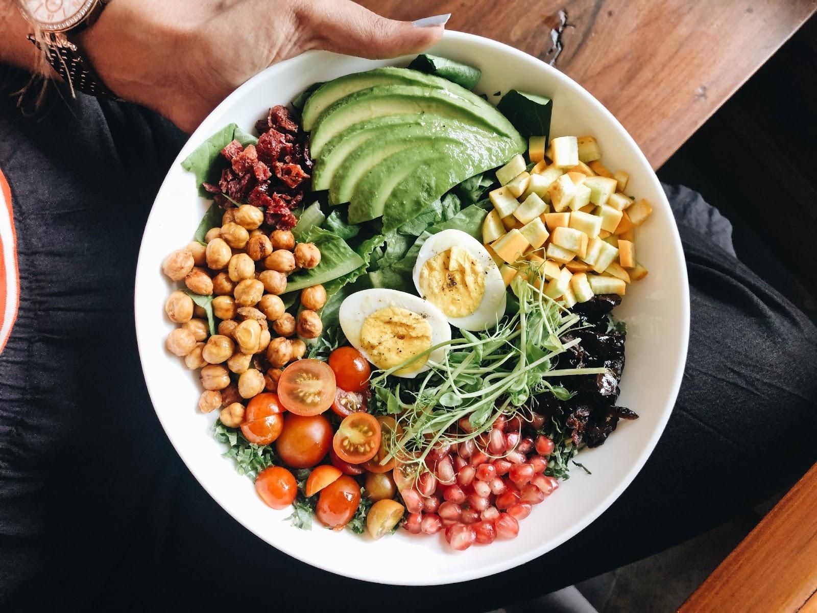 Las ensaladas siempre son una buena opción para realizar un plato variado y equilibrado. Como base utiliza verduras de hoja verde como la lechuga, espinacas, canónigos o rúcula. Sobre esta base añade la verdura y fruta que más te guste. En este caso hemos optado por tomates cherry y granada, que además de tener gran poder antioxidante le dará un toque dulce a tu plato. Los garbanzos, el huevo y el queso son una fuente proteica de calidad y el aguacate nos aportará las grasas saludables necesarias del plato. Acompáñalo de una rodaja de pan para aumentar la cantidad de carbohidratos de esta comida.