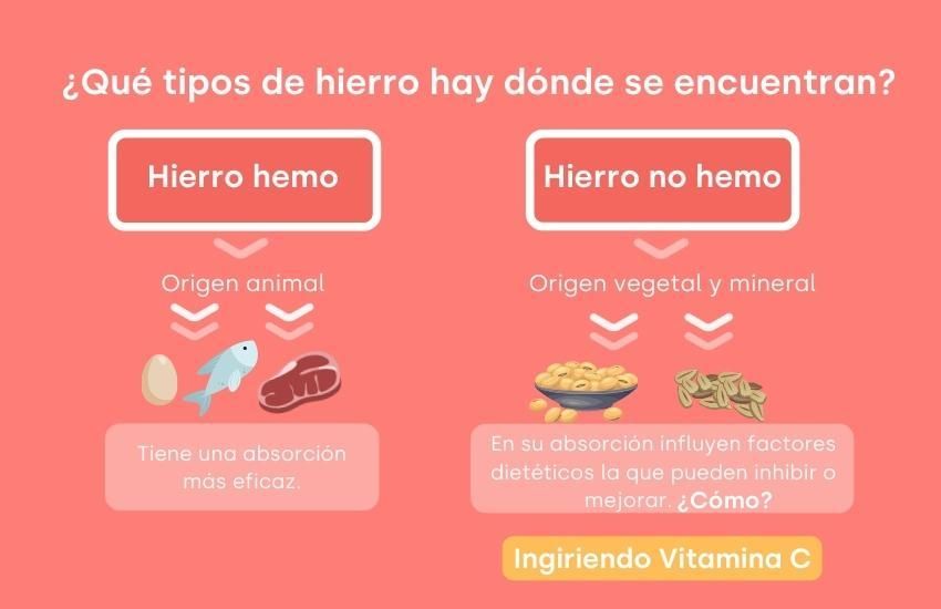 El hierro lo podemos encontrar de dos maneras: en forma hemo, cuya absorción es más eficaz, y en forma no hemo: la única diferencia entre ambos es cómo y a partir de dónde los obtenemos… El hierro hemo solamente está presente en alimentos de origen animal, por lo que el hierro que obtiene una persona vegetariana es el hierro no hemo. Si que es importante tener en cuenta que la absorción del hierro no hemo está influenciada por factores dietéticos que pueden inhibir o mejorar su absorción, y es importante saberlo a la hora de preparar tus comidas (1).