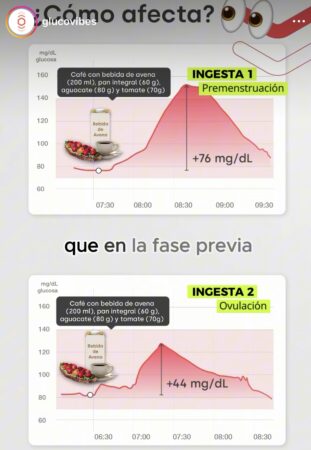 En la imagen puedes ver cómo en fase lútea previo a los días de menstruación, la misma comida afecta de una forma más pronunciada. Esto se debe a esa resistencia a la insulina que la mujer suele experimentar en esta fase del ciclo menstrual.