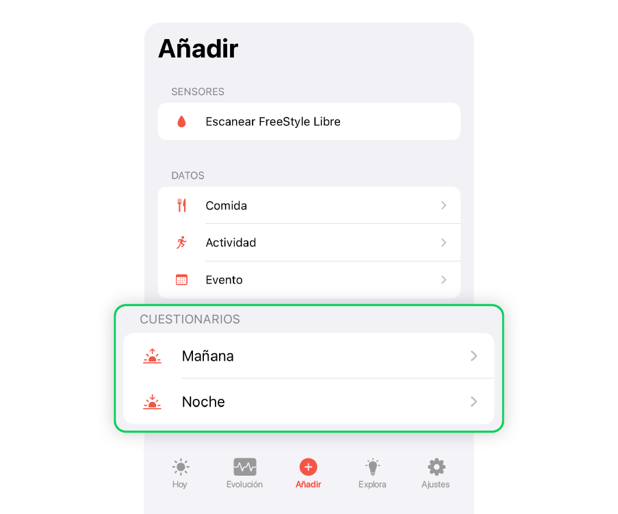 En nuestra aplicación Glucovibes podrás encontrar los dos cuestionarios necesarios para calcular tu VibeBattery. Uno de ellos para rellenar por la noche, tras la jornada diaria, y otro para rellenar a la mañana, nada más levantarte. Es importante destacar que completar ambos cuestionarios es necesario para tener un resultado ya que la relación entre ambos nos da la información precisa que representa VibeBattery.