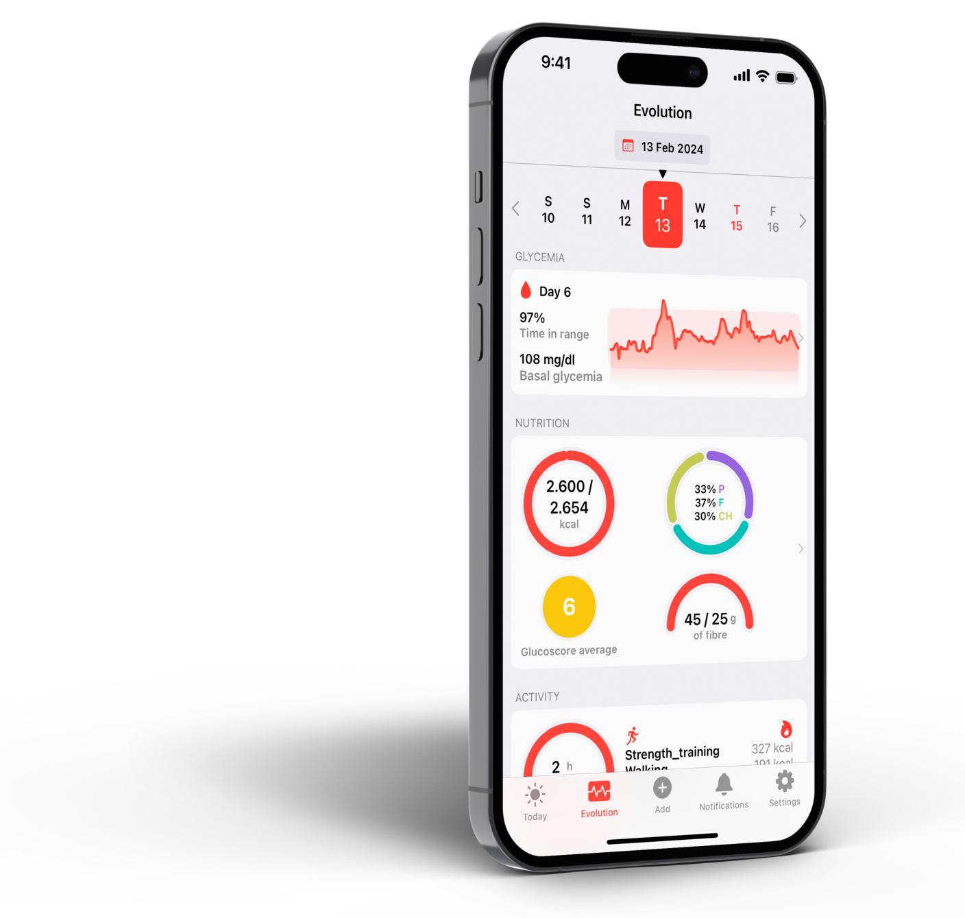 The Glucovibes app enables monitoring of blood glucose levels, intakes, activity and rest quality, among others. Add this information daily throughout the sensorization period by following the instructions that you will receive in the app and in your email.