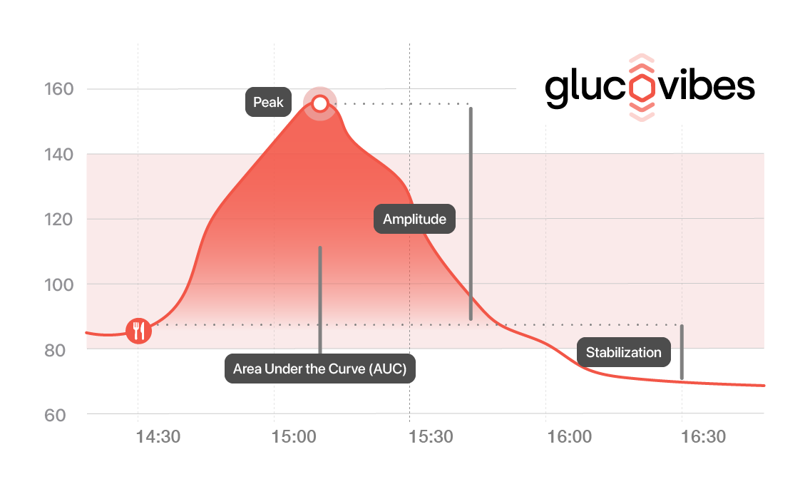 To calculate the Glucoscore, our technology individually analyzes each intake using the glucose data recorded in the app from the time of consumption up to two hours afterward (known as postprandial glucose). In the learning process, four parameters have been used to characterize and classify the glucose curves, which we also provide to you. These parameters represent key characteristics of the impact of the intake on glucose levels: