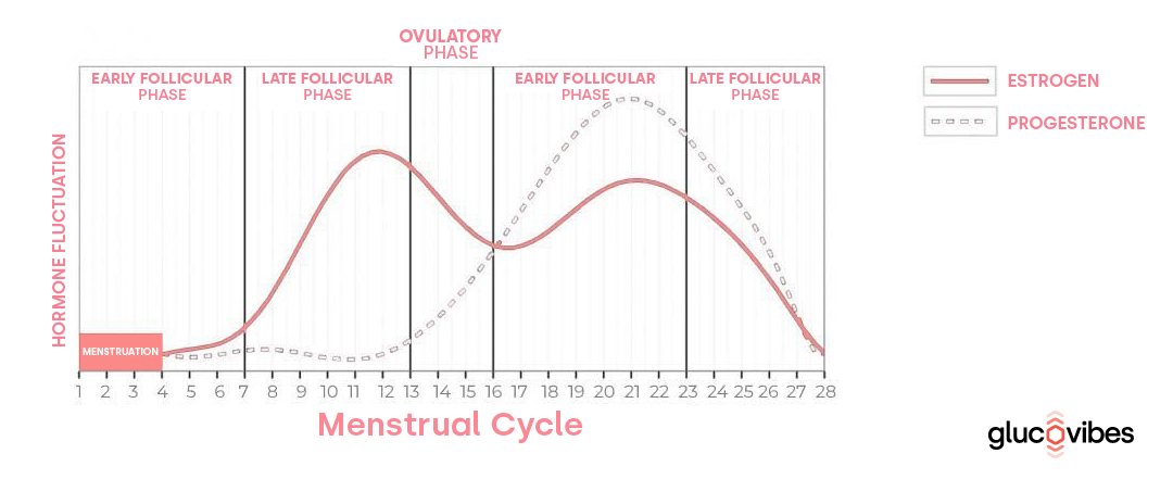 Estrogen: Promotes increased sensitivity of cells to insulin and enhances glycogen storage. Thus, during the follicular phase when estrogen levels are higher, blood glucose levels tend to decrease.